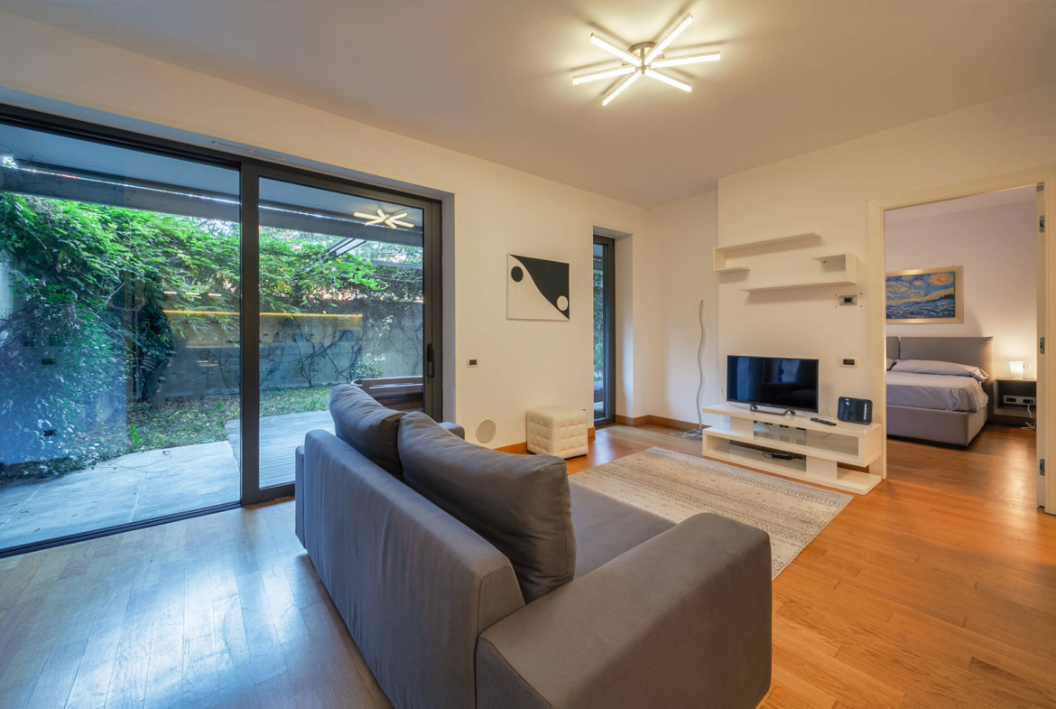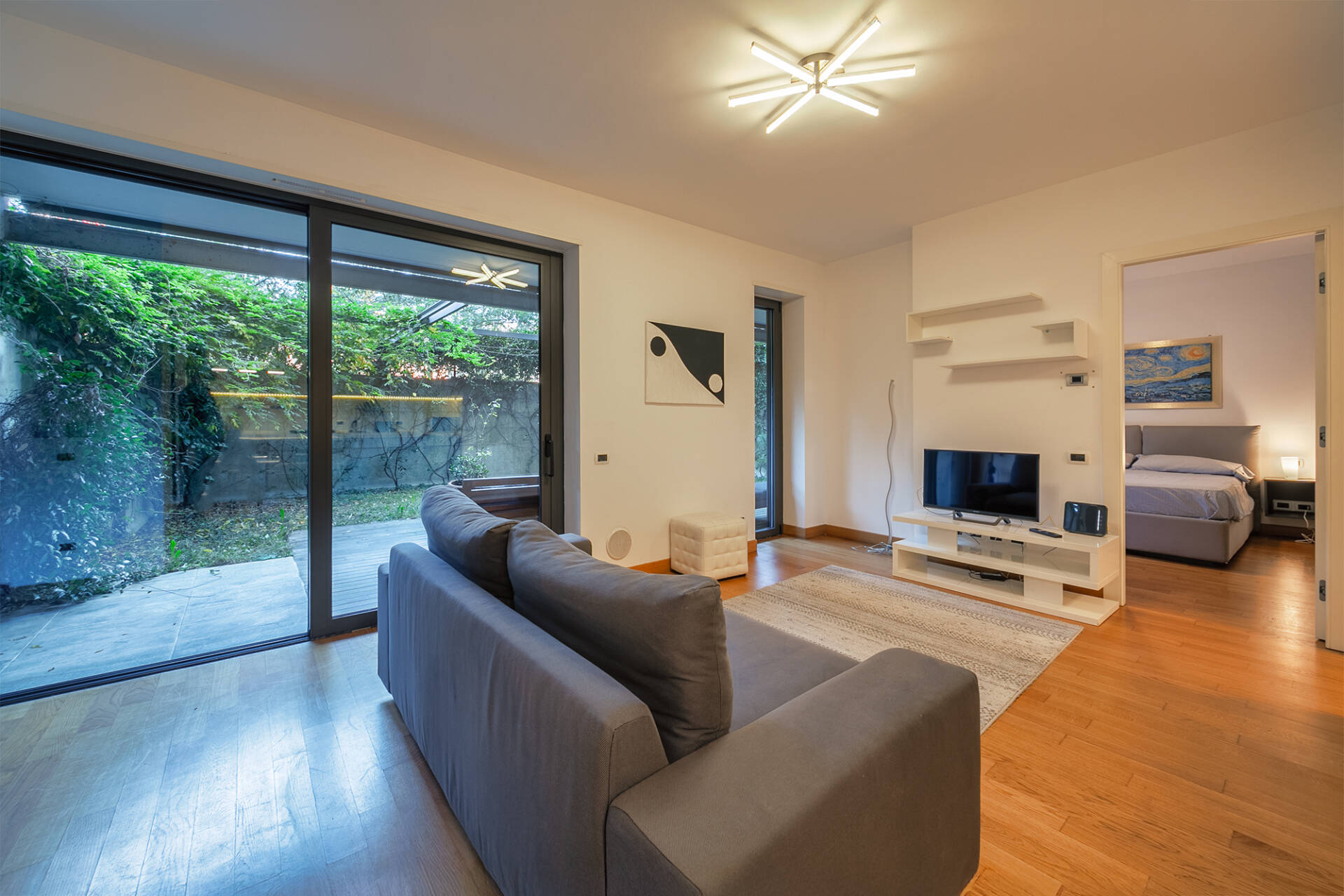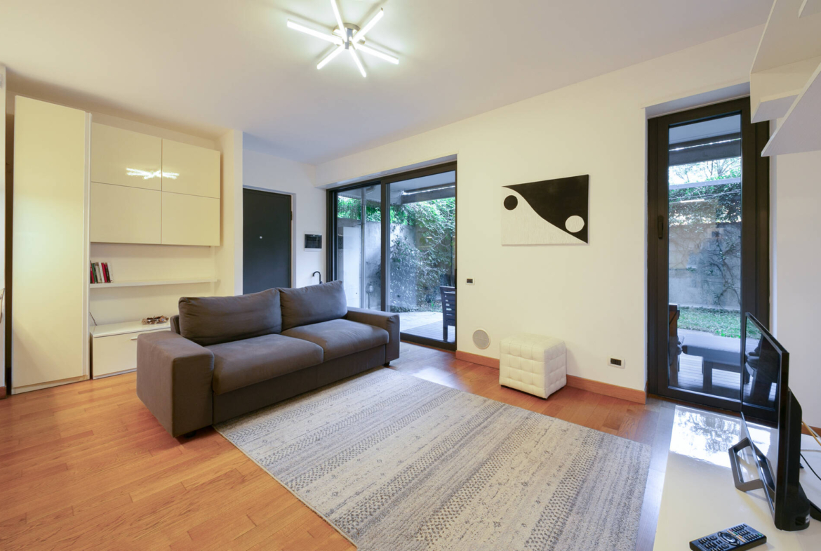 L’appartamento è composto da ingresso su zona giorno con cucina a vista, ampia vetrata che conduce al giardino, camera e bagno.