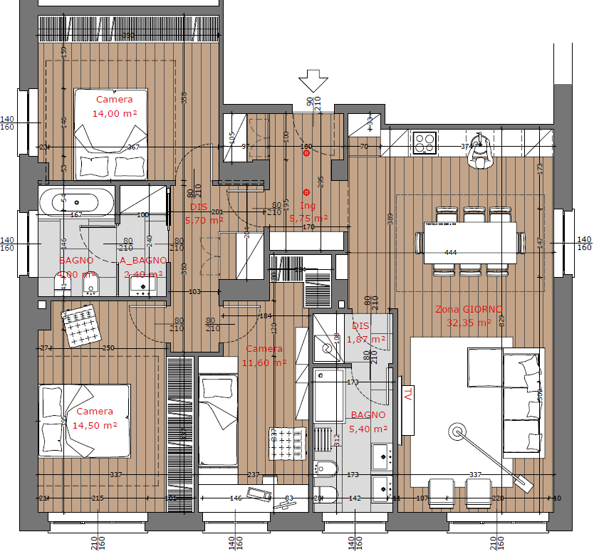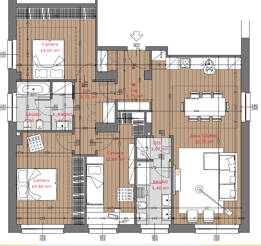 Ingresso, sala con cucina a vista, due camere matrimoniali, cameretta e doppi servizi.